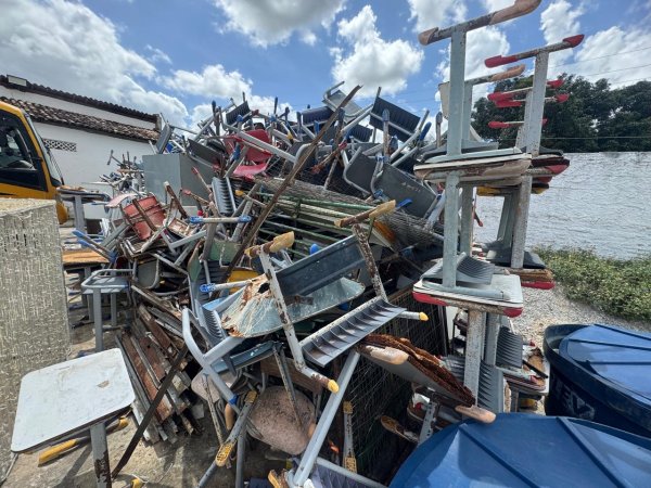 DIVERSOS MATERIAIS SUCATEADOS: CADEIRAS E MESAS ESCOLARES, LONGARINAS, MESAS, ARMARIOS EM AÇO E MADEIRA, FREEZER, GELÁGUA, CONDICIONADORES DE AR, FOGÃO E ALGUNS EQUIPAMENTOS DE INFORMÁTICA SUCATEADOS.
