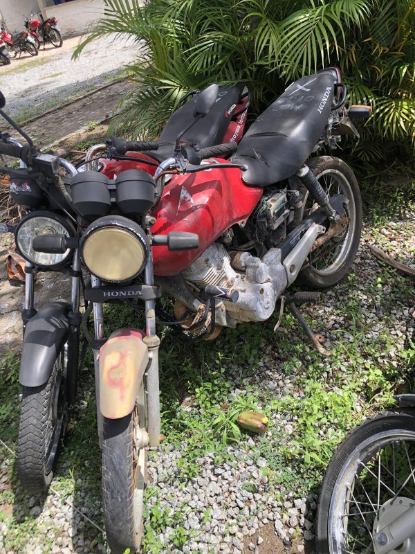HONDA/CG 125 TITAN ES, ANO/MOD 2000/2001, COR VERMELHA, COMBUS GASOLINA, PLACA MUY6191, RENAVAM 752087576, CHASSI 9C2JC30201R016984, N° MOTOR JC30E21016984. (SITUAÇÃO DO VEÍCULO: PLACA E CARENAGENS AUSENTES, RETROVISOR ESQUERDO QUEBRADO, BANCO RASGADO, TANQUE AMASSADO, CHASSI EM ESTADO AVANÇADO DE OXIDAÇÃO, REGULARIZAÇÃO, TRATAMENTO OU REMARCAÇÃO POR CONTA DO COMPRADOR).