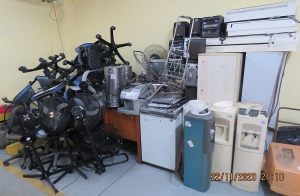 25 Cadeiras, 10 Ventiladores, 02 Mesas, 02 Armários, 03 Carrinhos de Transporte de processos, 05 Bebedouro, 03 Aparelhos de Ar Condicionado, 02 Frigobar, 02 Cafeteiras Elétricas, 01 Forno Micro-ondas, 03 Máquinas de Escrever elétricas, 02 Guilhotinas, 01 Liquidificador, 01 Lavadora de alta pressão.