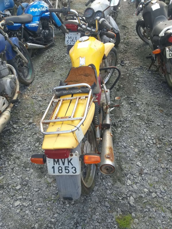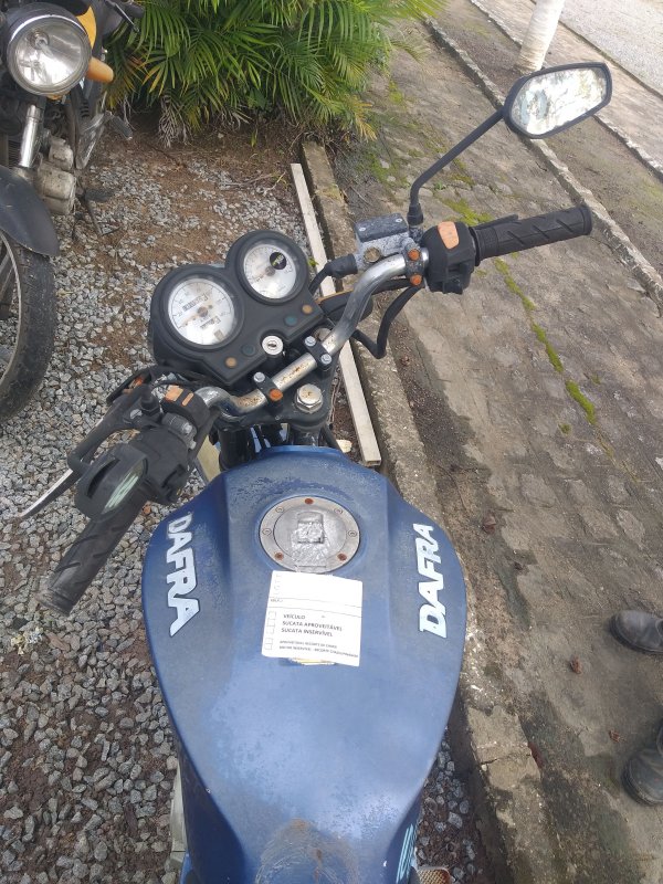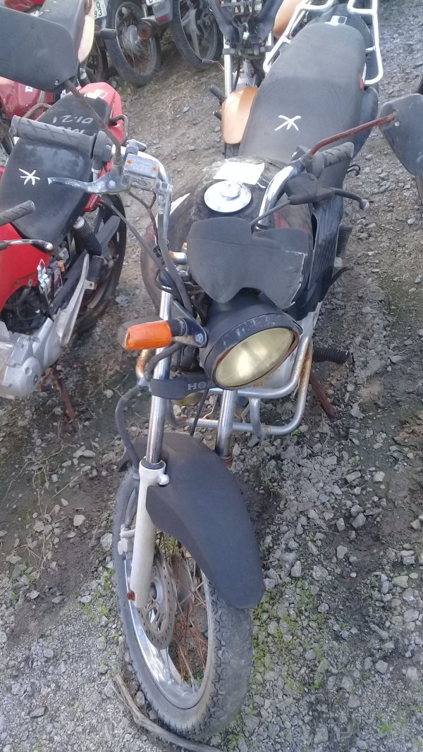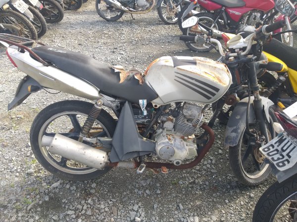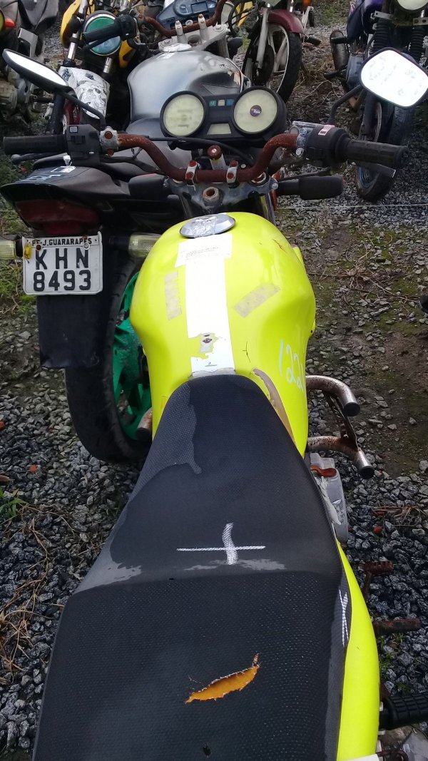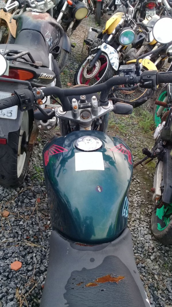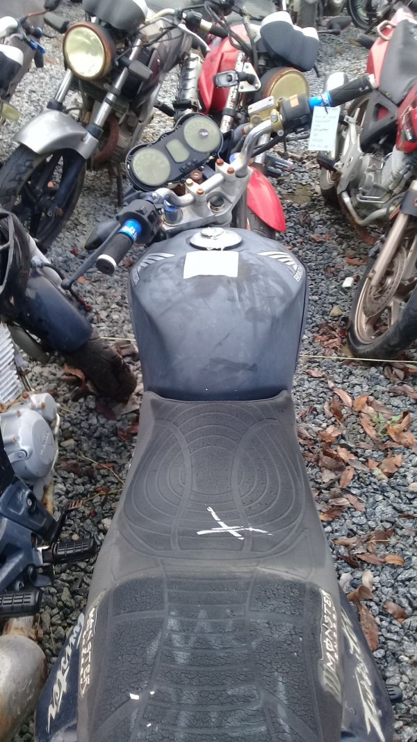 PLACA, CARENAGENS, PAINEL, FAROL, PISCAS DIANTEIRO, PARA-LAMA E LANTERNA DANIFICADOS, TANQUE COM MOSSAS, LACRE ROMPIDO, CARENAGEM TRASEIRA DIREITA, RETROVISOR DIREITO E PISCAS TRASEIRO AUSENTES, CHASSI EM ESTADO INICIAL DE OXIDAÇÃO, DECALQUE LEGÍVEL, TRATAMENTO E REGULARIZAÇÃO POR CONTA DO COMPRADOR.
