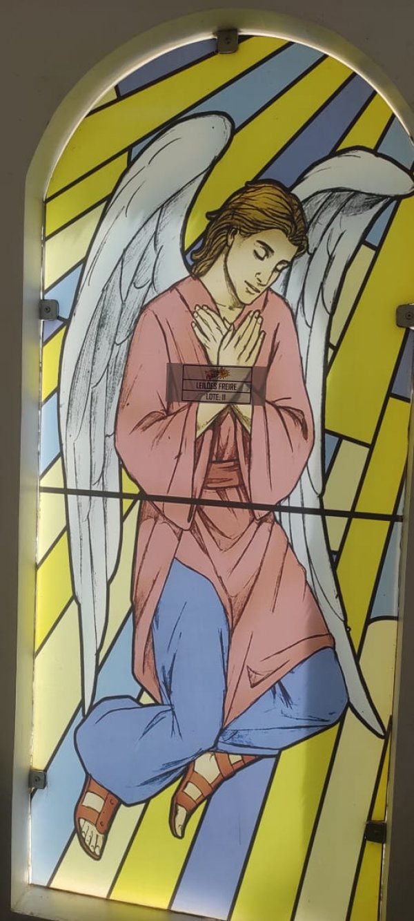 PORTAS DE VIDRO DA IGREJA LADO ESQUERDO COM FORRA E BADANA SUPERIOR EM VIDRO MADEIRA SUPERIOR, 2.80 X 1,23 DE LARGURA CADA PORTA, MAIS VIDRO LATERAL DE 2,80 X 2,0 .