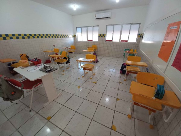 1 CADEIRA DE PROFESSOR SEM BRAÇO, 13 CADEIRAS ESCOLAR COM MESA(MARCA DESK), 1 ARMÁRIO DE AÇO COM 2 PORTAS, 2 LIXEIRAS, 1 SUPORTE PARA NOTEBOOK, 2 JANELAS DE CORRER (1 COM OITO PELAS E 1 COM QUATRO PEÇAS), 1 QUADRO BRANCO, 1 AR CONDICIONADO (MARCA GREE - 18.000 BTUS), TOMADAS E INTERRUPTOR, LUMINÁRIAS.