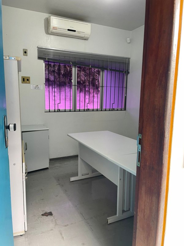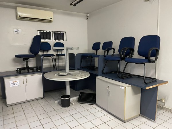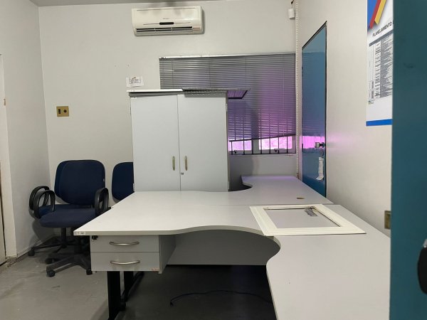 01 BIRÔ DE MADEIRA EM “L”, 02 CADEIRAS P/ ESCRITÓRIO FIXAS, 01 CADEIRA P/ ESCRITÓRIO C/ RODAS, 01 RELÓGIO DE PONTO HENRY E 01 CONDICIONADOR DE AR SPLIT SAMSUNG.