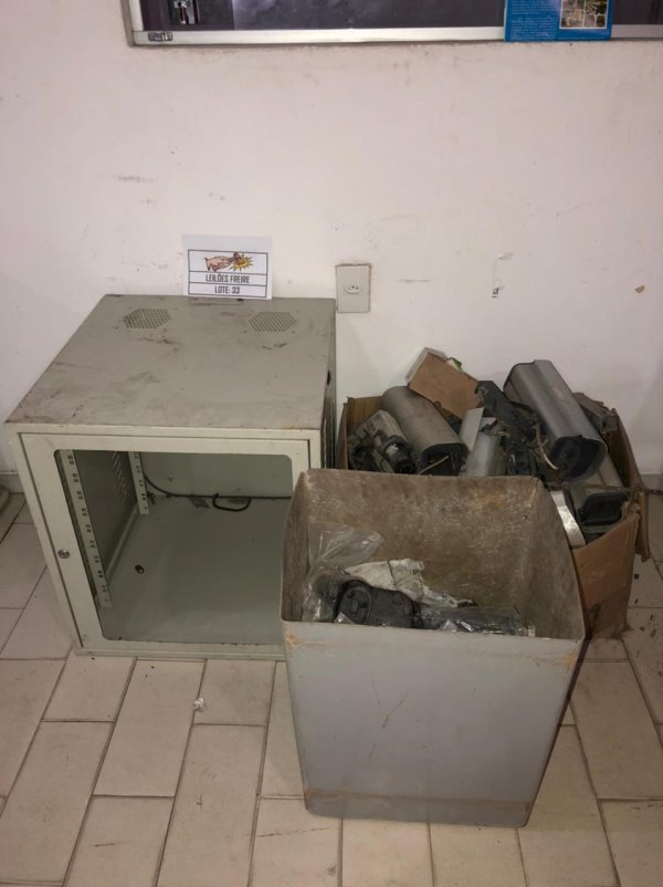 DIVERSAS CÂMERAS DE VIGILÂNCIA (MODELOS E TIPOS DIVERSOS, ALGUNS DESMONTADOS E/OU DANIFICADOS E PROVAVELMENTE FALTANDO PARTES E PEÇAS) E 1 CAIXA ORGANIZADORA PARA FIOS E DVR