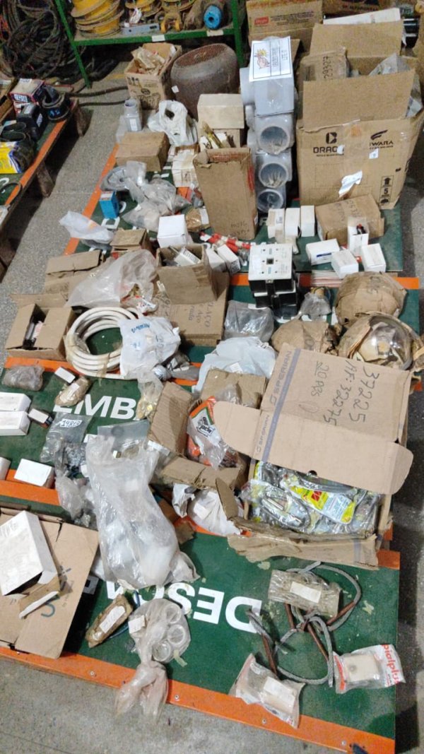 DIVERSAS PEÇAS NOVAS DE ALMOXARIFADO: 7 ANEL PROTECAO BASE 25A SIEMENS 5SH3 32 (CÓD.10027) PEÇA. // 16 ELO FUS ALTA TENSÃO CALIBRADO 140K (CÓD.10032) PEÇA. // 5 ELO FUSÍVEL ALTA TENSÃO 100K X 500MM (CÓD.10039) PEÇA. // 10 ELO FUSÍVEL ALTA TENSÃO CALIBRADO 130K (CÓD.10042) PEÇA. // 58 FUSIVEL DIAZED 20A/500V SIEMENS 5SB2 71 (CÓD.10056) PEÇA. // 50 FUSIVEL DIAZED 35A/500V SIEMENS 5SB4 11 (CÓD.10058) PEÇA. // 5 MICRO INTERRUPTOR SCHNEIDER XC1-ZP2905 (CÓD.10095) PEÇA. // 1 SUPORTE MONT IND RELÉ SIEMENS 3UX1 420 (CÓD.10102) PEÇA. // 4 RELÉ TRIP 0,40-0,63A TELEMEC LR1-D09304 (CÓD.10163) PEÇA. // 2 RELÉ TRIP 0,63 - 1A TELEMEC LR1-D09305 (CÓD.10164) PEÇA. // 2 RELÉ TRIP 1 - 1,6A TELEMEC LR1-D09306 (CÓD.10165) PEÇA. // 3 RELE TRIP 7 - 10A TELEMEC LR1-D09314 (CÓD.10168) PEÇA. // 47 COTOVELO EXTERNO PIAL LEGRAND 309 92 (CÓD.10185) PEÇA. // 7 COTOVELO EXT/INTERNO PIAL LEGRAND 299 01 (CÓD.10186) PEÇA. // 13 DERIVAÇÃO MATA-JUNTA PIAL 299 04 (CÓD.10187) PEÇA. // 28 LUVA MATA-JUNTA PIAL LEGRAND 299 05 (CÓD.10196) PEÇA. // 5 TAMPA EXTREMIDADE MATA-JUNTA PIAL 299 00 (CÓD.10200) PEÇA. // 2 LAMPADA SINALIZ 260V 20MA/W KOOMEI K-62 (CÓD.10213) PEÇA. // 6 CONECTOR CURVO 90° 1/2 JACTO 317529 (CÓD.12741) PEÇA. // 8 SUPORTE ARTICULAÇÃO JACTO 223446 (CÓD.12789) PEÇA. // 16 PARAFUSO AJUSTE 6A SIEMENS 5SH3 12 (CÓD.13138) PEÇA. // 2 DÍODO RETIFICADOR A2B 260/05 (CÓD.14800) PEÇA. // 4 POTENCIÔMETRO CONSTANTA DE 3K3 (CÓD.14810) PEÇA. // 7 TRANSFORMADOR ELETRONICO MODELO EHC 250-1 (CÓD.14828) PEÇA. // 4 TRANSFORMADOR LÂMPADA DICRÓICA (CÓD.14830) PEÇA. // 6 CABO NEOPRENE DE 1 X 50 MM2 (CÓD.14840) M. // 39 FUSIVEL 13004 PIAL LEGRAND (CÓD.14845) PEÇA. // 17 FUSIVEL 13020 PIAL LEGRAND 20 AMPERES (CÓD.14846) PEÇA. // 3 TERMINAL CONCÊNTRICO PRESSÃO TIPO DERIVAÇÃO COBRE 3/8 (CÓD.14964) PEÇA. // 2 BOBINA TIPO LX1FH092 CONTATOR TIPO LC1FH43 220 VCA 60HZ (CÓD.14988) PEÇA. // 3 CONTATOS PRINCIPAIS CONTATOR TIPO 3TA-24 (CÓD.15011) CONJUNTO. // 3 CAMARA FAISCA CONTATOR TIPO 3TB54 (CÓD.15012) PEÇA. // 2 EIXO RETIFICADOR MOTOR VENT 1/5 CV AC 000215 1300/1500 RPM (CÓD.15015) PEÇA. // 1 EIXO RETIFICADOR MOTOR VENT 1/8 CV AC 001199 960/870 RPM (CÓD.15016) PEÇA. // 2 RELE REFERÊNCIA MR321024 24V 10A/250V (CÓD.15025) PEÇA. // 2 TAMPA DEFLETORA CARCAÇA 160 4P WEG (CÓD.15046) PEÇA. // 4 ESCOVA CARVÃO 40 X 25 X 20 (CÓD.15053) PEÇA. // 13 CONDULETE ALUMÍNIO COM TAMPA LR 3" BSP (CÓD.15085) PEÇA. // 3 REFRATOR VIDRO LUMINÁRIA 20/3 (CÓD.15109) PEÇA. // 10 IGNITOR LÂMPADA VAPOR METÁLICO 1000 W (CÓD.15125) PEÇA. // 2 PORTA ESCOVA COMPLETO TIPO EA5-280M (CÓD.15635) PEÇA. // 4 ANEL - 851.138 M1 (CÓD.15796) PEÇA. // 2 BOTÃO COMANDO B2/05 - E111 (CÓD.16744) PEÇA. // 1 CONECTOR DERIVAÇÃO T MACROLUZ NT-3232 (CÓD.16887) PEÇA. // 2 INTERRUPTOR POSICAO XCK-J 10559 (CÓD.17199) PEÇA. // 3 SUPORTE PARA RELE TELEMEC LA7-D0964A65 (CÓD.17484) PEÇA. // 3 TAMPA MATA-JUNTA PIAL LEGRAND 304 00 (CÓD.17971) PEÇA. // 4 EXTENSAO DIO A-145-SP TAMPA COD - 35.25.016.0 (CÓD.19047) PEÇA. // 2 TEE VERTICAL DESCIDA DA LATERAL TIPO NULLUNULL REF. 126070200/075-Z (CÓD.19209) PEÇA. // 5 ESPELHO P/ SISTEMA X C/ 02 P P/ JAC. AMP. 86.634 (CÓD.19216) PEÇA. // 8 FUSIVEL NH3 TIPO F3NH500 (CÓD.19839) PEÇA. // 1 BOBINA 220V/60HZ SIEMENS 3TY6 543-OAN1 (CÓD.21271) PEÇA. // 4 PECA DE ARRASTE BOSCH 0601215078 (CÓD.21667) PEÇA. // 2 DIODO RETIFICADOR SEMIKRON SKN 320/04 (CÓD.25198) PEÇA. // 12 FUSIVEL SITOR 1 80A SIEMENS 3NE4 220 (CÓD.25336) PEÇA. // 30 LAMPADA SINALIZ BASE BA 9S 20MA130V (CÓD.25392) PEÇA. // 52 FUSIVEL ELO TIPO K 170A 15KV (CÓD.37225) PEÇA. // 45 ELO FUSÍVEL ALTA TENSÃO 200K X 500MM (CÓD.37226) PEÇA. // 36 BORNE CONCENT TIPO TERMIN CENTR MAGNET 5/8", (CÓD.37250) PEÇA. // 2 FITA AÇO INOX 3/4" HANSA-FLEX BANDIT (CÓD.37296) PEÇA. // 3 CONDULETE ALUM 1 1/4" S/R WETZEL LRSR-25 (CÓD.39712) PEÇA. // 2 BOTAO IMPULSAO PRETO TELEMEC XB4-BA21 (CÓD.40506) PEÇA. // 3 FUSÍVEL NH T2 400A 690V ULTRA RÁPIDO (CÓD.41549) PEÇA. // 3 FUSÍVEL NH T2 500A 690V ULTRA RÁPIDO (CÓD.41550) PEÇA. // 1 MANGUEIRA FIAT 46535629 (CÓD.41589) PEÇA. // 1 TOMADA 20 DB SIST COLETIVO TV 1 SAIDA 635036 (CÓD.42487) PEÇA. // 1 TOMADA 16 DB SIST COLETIVO TV 1 SAIDA 635035 (CÓD.42488) PEÇA. // 4 TAMPA PROT TERMINAIS 79.5MM EPEÇAOS (CÓD.45228) PEÇA. // 2 LUMINARIA MATA INSETOS TASCHIBRA PROTECT (CÓD.46036) PEÇA. // 1 TRANSFORMADOR POTENCIAL 8050V/115V 500VA SOLTRAN (CÓD.47711) PEÇA.