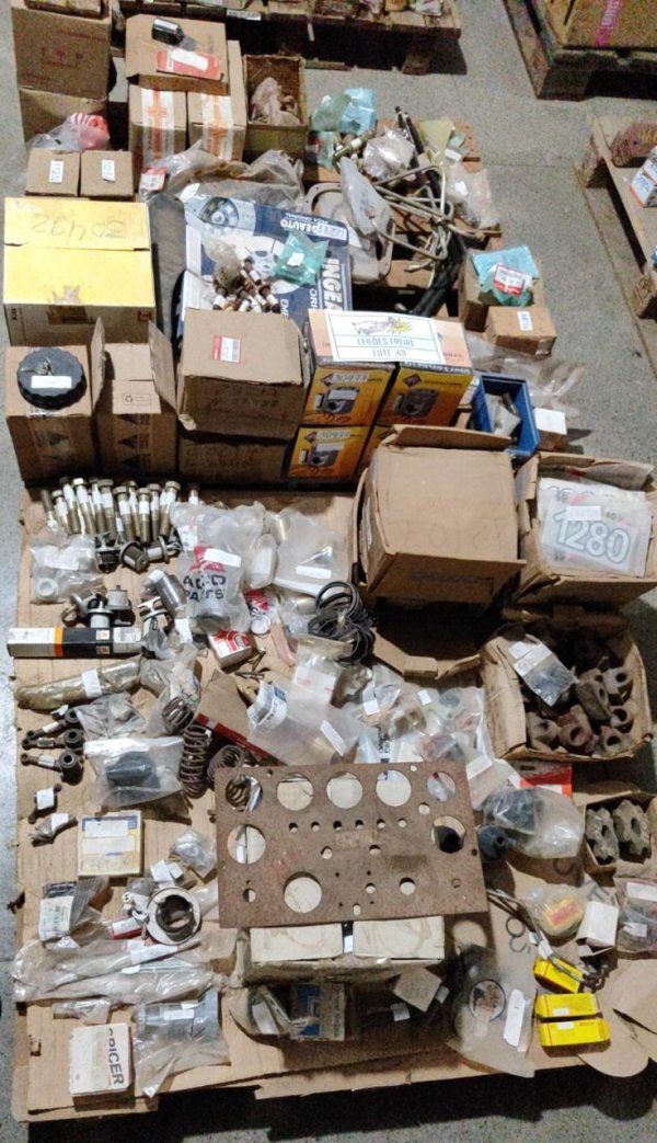 DIVERSAS PEÇAS NOVAS DE ALMOXARIFADO: 36 JOGO RAIO B.9 X 225.5 HONDA 9728252291RO (CÓD.11040) PEÇA. // 1 CAPA CORRENTE TRANSM HONDA 40510437970ZA (CÓD.11096) PEÇA. // 1 GUIA CORRENTE TRANSM HONDA 52170437000 (CÓD.11120) PEÇA. // 5 PINHÃO TRANSMISSÃO HONDA 23801437000 (CÓD.11128) PEÇA. // 3 ESPAÇADOR LAT ROD TRAS HONDA 42311KBB900 (CÓD.11155) PEÇA. // 3 CORPO BOMBA ÓLEO LUBRIF PERKINS 37714234 (CÓD.11232) PEÇA. // 3 BICO INJETOR COMB BOSCH 0.434.200.001 (CÓD.11269) PEÇA. // 1 SUPORTE ESC MOT PART BOSCH 9.001.082.239 (CÓD.11403) PEÇA. // 1 REPARO CXA DIREÇ MEC JG MB 344.461.70.80 (CÓD.11779) PEÇA. // 28 CASTANHA TRASEIRA SCANIA 64252 (CÓD.11848) PEÇA. // 1 CRUZETA TRANSMISSÃO GM 7322190 (CÓD.11889) PEÇA. // 25 ANEL GUIA CILINDRO HIDR VALMET KH3307 (CÓD.11949) PEÇA. // 2 GARFO SELETOR CAIXA CÂMBIO VALTRA 868770 (CÓD.12087) PEÇA. // 4 SUPORTE ENGRENAGEM EIXO VALTRA 440830 (CÓD.12107) PEÇA. // 1 DISCO EMBREAGEM MF 3146810M91 (CÓD.12288) PEÇA. // 8 PARAFUSO BRAÇO EIXO DIANT MF 490019M1 (CÓD.12318) PEÇA. // 9 ROLETE PINO BARRA TRAÇÃO MF 762234M2 (CÓD.12336) PEÇA. // 20 PARAFUSO BRAÇO INFERIOR HIDR MF 353934X1 (CÓD.12354) PEÇA. // 1 PLACA PAÍNEL CAT 4V6123 (CÓD.12486) PEÇA. // 2 JUNTA TAMPA DISTR MOT MB 352.015.03.20 (CÓD.13666) PEÇA. // 1 BOBINA FORÇA XLR 2002 (CÓD.15613) PEÇA. // 3 BIELA REG PONTO (CÓD.ABERTA) (CÓD.16715) PEÇA. // 1 BOBINA CAMPO 2.710.456 (CÓD.16719) PEÇA. // 1 BOMBA - 105.2508 (CÓD.16720) PEÇA. // 5 BUCHA BRAÇO AMORT HONDA 52464KY7000 (CÓD.16761) PEÇA. // 2 CABEÇOTE COMANDO XCK - D 15 (CÓD.16793) PEÇA. // 8 CAPA - 068.4497 (CÓD.16814) PEÇA. // 2 CAPA BORRACHA - YB40 27150 (CÓD.16817) PEÇA. // 3 CASQUILHO - 4.994.075 (CÓD.16829) PEÇA. // 2 ELEMENTO BBA INJ BOSCH 9.411.085.007.740 (CÓD.17015) PEÇA. // 1 CONJUNTO ENGRENAGEM TRANSM MF 023412N1 (CÓD.17041) PEÇA. // 2 ENGRENAGEM Z 7 - 606601 (CÓD.17076) PEÇA. // 3 MOLA CABEÇOTE (CÓD.17335) PEÇA. // 1 MONTALTO EMBUTIR 1013.01 (CÓD.17346) PEÇA. // 7 PINO ROSCADO AÇO 81467110 (CÓD.17414) PEÇA. // 2 SUB-FIAÇÃO LANTERNA TRASEIRA HONDA - 32200.437.970 (CÓD.17559) PEÇA. // 1 TAMPA TOMADA POTÊNCIA MF 3149447M1 (CÓD.17603) PEÇA. // 2 TERMINAL RETO LADO DIR YANMAR YB4012070 (CÓD.17677) PEÇA. // 1 TERMINAL RETO LADO ESQ YANMAR YB4012060 (CÓD.17678) PEÇA. // 6 TUBO 3.146.882 (CÓD.17701) PEÇA. // 2 TUBO - 70.991.518 (CÓD.17704) PEÇA. // 2 VELOCIMETRO - 331.4548 (CÓD.17746) CONJUNTO. // 12 PARAFUSO RODA DIANTEIRA FORD F4000 (CÓD.18931) PEÇA. // 1 CARCAÇA DIANTEIRA BBA HIDR MF 1665500M1 (CÓD.19041) PEÇA. // 4 CUBO RODA TRASEIRA HONDA 42601KW8901 (CÓD.19044) PEÇA. // 1 COIFA GARFO EMBREAGEM PUMA 087.260.021 (CÓD.19460) PEÇA. // 1 RETENTOR ÓLEO HONDA 91202GEO003 (CÓD.21761) PEÇA. // 1 ARRUELA CAIXA ACIONAM DIANT MF 3176217M1 (CÓD.23232) PEÇA. // 7 ANEL APOIO ALAV CAIXA MUD VALTRA 823350 (CÓD.24529) PEÇA. // 2 FIACAO PRINCIPAL HONDA 32100KFC900 (CÓD.27314) PEÇA. // 1 CONJ ROLAMENTO COLUNA DIREÇÃO 1134155851 (CÓD.27322) PEÇA. // 3 ÁRVORE PRINC TRANSM HONDA 23211383000 (CÓD.28636) PEÇA. // 4 ENGRENAGEM PRIMÁRIA HONDA 23481KFC900 (CÓD.28683) PEÇA. // 18 RETENTOR PÓ HONDA 91251KY7003 (CÓD.28742) PEÇA. // 2 ENGRENAGEM BBA OLEO PERKINS 31165531 (CÓD.28804) PEÇA. // 4 TAMPA CAM EMBOLO WABCO 9253010434 (CÓD.29269) PEÇA. // 2 PARAFUSO CUÍCA WABCO 884 538 012 2 (CÓD.29281) PEÇA. // 1 HASTE VALVULA FREIO MAO WABCO 9617237304 (CÓD.29367) PEÇA. // 1 COROA EIXO TRASEIRO MF 906803M1 (CÓD.29474) PEÇA. // 4 PISTAO METAL LEVE P&A 2257 (CÓD.30477) PEÇA. // 1 EIXO BALACEADOR PERKINS 70750044 (CÓD.30479) PEÇA. // 4 CAMISA UC 4579 STD MAXION S4T D-20 (CÓD.30492) PEÇA. // 1 MOLA MF 1686284M2 (CÓD.30708) PEÇA. // 4 BUCHA MANGA EIXO 35,00MM MB 321.332.00.49 (CÓD.30754) PEÇA. // 2 ARRUELA MANGA EIXO MB 383.332.00.97 (CÓD.30757) PEÇA. // 5 BALANCIM ADMISSÃO HONDA 14431397310 (CÓD.32287) PEÇA. // 5 BALANCIM ESCAPE HONDA 14441397310 (CÓD.32289) PEÇA. // 1 ANEL VEDACAO HONDA 91308GB4701 (CÓD.33768) PEÇA. // 2 ANEL 4/10 MB N915052004016 (CÓD.34813) PEÇA. // 2 EIXO VIRABREQUIM YANMAR NS9021510 (CÓD.34904) PEÇA. // 1 FLANGE MF 1860890M91 (CÓD.37345) PEÇA. // 18 PRISIONEIRO CUBO DIANT VALTRA HJ1908 (CÓD.37996) PEÇA. // 10 ADESIVO LATERAL CABINA VALTRA 81932400 (CÓD.38985) PEÇA. // 1 PISTÃO MOTOR 0,75 MM HONDA 13104KGA306 (CÓD.41500) PEÇA. // 1 KIT PRO LINK ARTICULADO MGA (CÓD.41586) PEÇA. // 2 JOGO PISTÃO CARBURADOR HONDA 16022KFC900 (CÓD.41666) PEÇA. // 24 ANEL VEDAÇÃO LUVA INJ CUMMINS 3007759 (CÓD.45901) PEÇA. // 1 MANCAL YANMAR NS1123400 (CÓD.48498) PEÇA. // 2 JUNTA DISTRIBUICAO MOTOR NEW HOLLAND 98424046 (CÓD.49900) PEÇA.