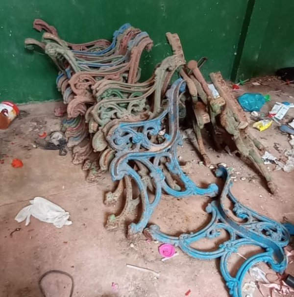 GRANDE QUANTIDADE DE SUCATA DIVERSA: CADEIRAS, BIRÔS, ARQUIVOS DE FERRO, BEBEDOURO, MACAS, ETC.