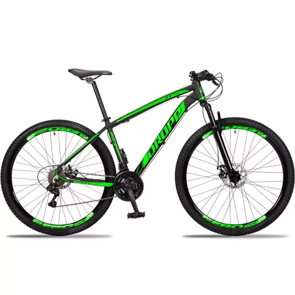 1 BICICLETA 29 DROPP RACE PT/RS T19 21M AL F DISCO // BICICLETA ARO 29 FREIO A DISCO 21M. VELOX PRETO/VERDE - ELLO BIKE // 1 BICICLETA 29 ALUMINUM RAIDER PT/CZ T17 21M F DISCO SUSP DT