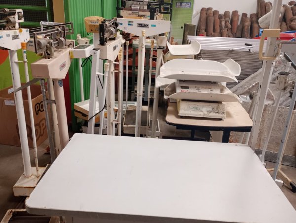 DIVERSOS MATERIAIS DA SECRETARIA DE SAÚDE: BALANÇAS, BIRÔ, BIONGOS, CADEIRAS DE RODAS, MESA OPERATÔRIA, FOCO, MOLETAS, BALCÃO COM PIA, ARQUIVO COM RODAS, CAMA HOSPITALAR, HIGIENIZADOR DE ÁLCOOL.