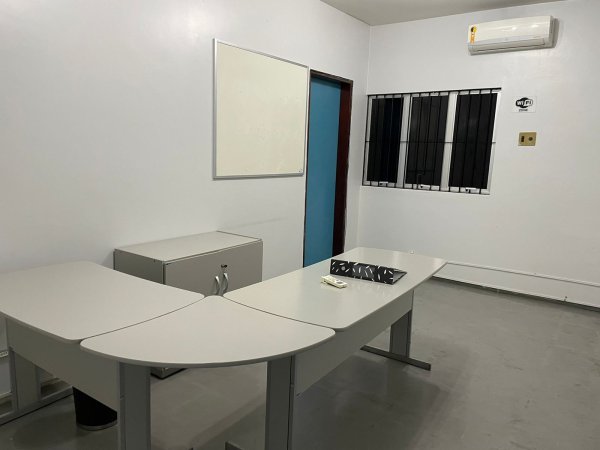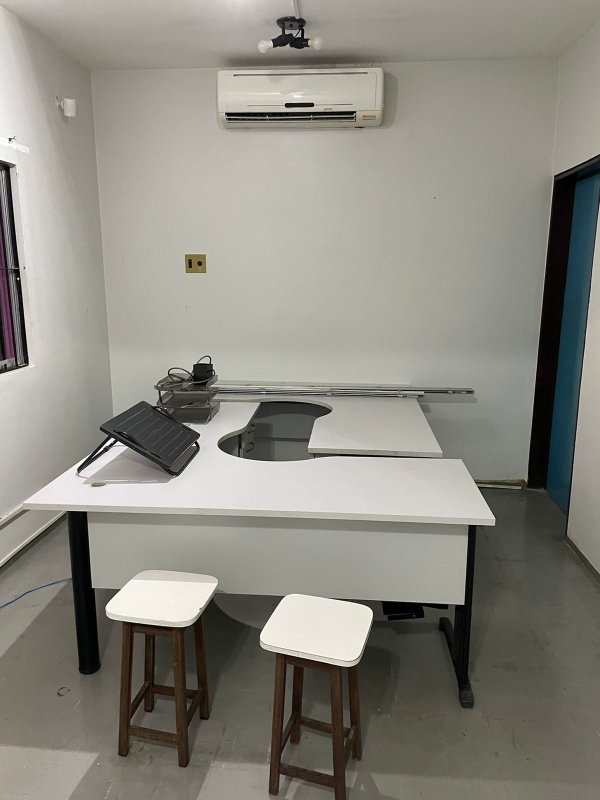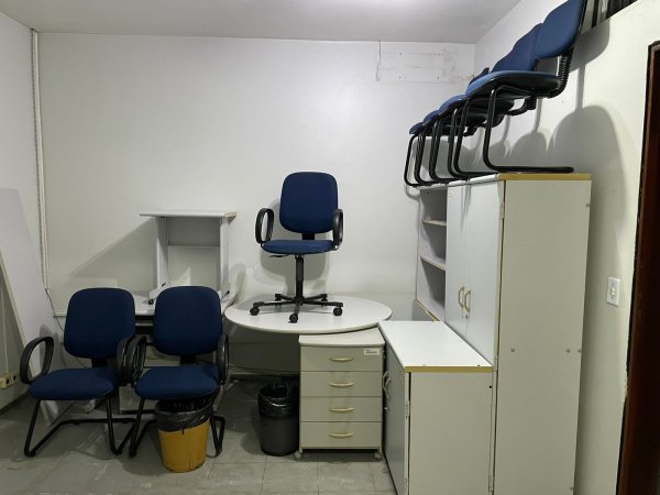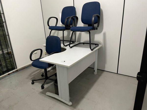 01 BIRÔ DE MADEIRA EM “L”, 02 CADEIRAS P/ ESCRITÓRIO FIXAS, 01 CADEIRA P/ ESCRITÓRIO C/ RODAS, 01 RELÓGIO DE PONTO HENRY E 01 CONDICIONADOR DE AR SPLIT SAMSUNG.