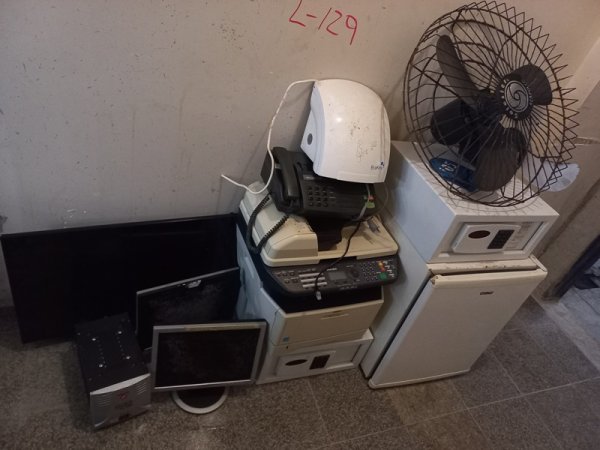 1 FRIGOBAR CONSUL, 2 VENTILADORES DE PAREDE, 2 BOMBAS SUBMERSSAS, 2 TVS DE 32 POLEGADAS "AOC", 1 ESTABILIZADOR, 2 MONITORES, 1 COPIADORA, 1 APARELHO DE FAX, 1 COFRE ELETRÔNICO DIGITAL EM AÇO, MARCA SUPER SAFE E 1 SECADOR DE MÃO.