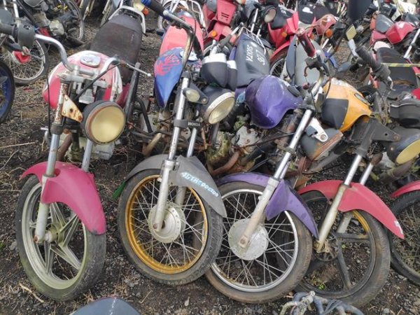 5 MOTOCICLETAS: YAMAHA/YBR 125E, 2004/2004, ROXA, HZQ6475 (SUCATA APROVEITÁVEL) HONDA/C100 BIZ, 2004/2005, PRETA, NFI5275 (SUCATA APROVEITÁVEL) HONDA/NXR150 BROS ES, 2006/2006, VERMELHA, KJJ2224 (SUCATA APROVEITÁVEL) HONDA/CG 125 TITAN KSE, 2003/2003, VERMELHA, JQU0365 (SUCATA APROVEITÁVEL) I/WUYANG WY48Q-2 , PRETA S/, PLACA95 (SUCATA FERROZA)