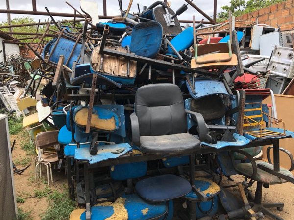 GRANDE QUANTIDADE DE MÓVEIS P/ ESCRITÓRIO E ESCOLAR: CADEIRAS DE ESCRITÓRIO, CADEIRAS E MESAS ESCOLARES, ARMÁRIOS DE AÇO, VENTILADORES E CONDICIONADORES DE AR SUCATEADOS.